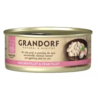 Grandorf — повністю натуральне харчування для кішок з добірного м'ясного та рибного філе класу Холістик, приготоване у власному соку. Використовується тільки добірна парна та охолоджена, а не заморожена сировина.